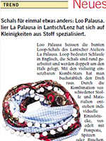 Südostschweiz - 28.08.2011 Loop-Schals von La Palausa sind für jeden Anlass genau das richtige Accessoire. Durch die kombination verschiedener Stoffe und Materialien entstehen individuelle Einzelstücke. |